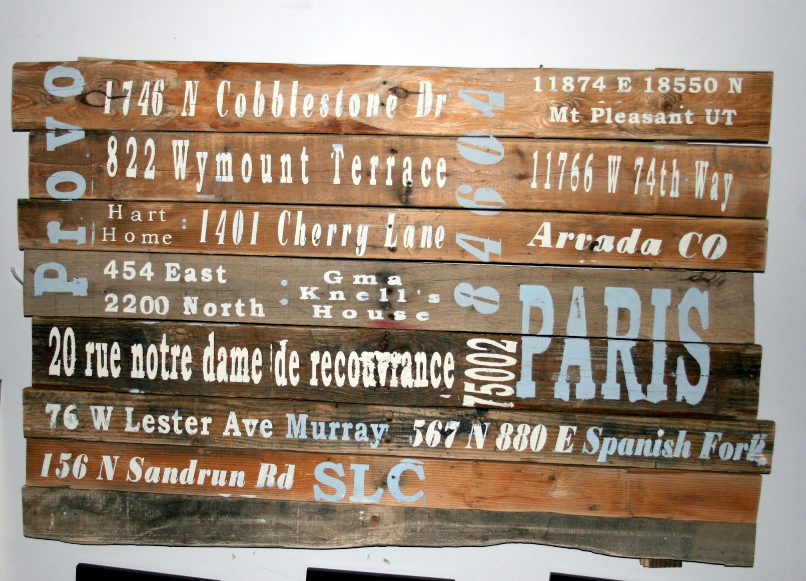 9. Be sure to measure each board (length and height) so you know how much room you have to add the text. Then play with different fonts and move around the text until you see what fits and looks right. I created a workspace that was the size of the pallet on the screen, just so I could see how it all fit. But my cutting mat is only 12"x 24" so I cut in different phases. I used Bookman old style (in bold) and Bodoni MT Black for the fonts. These addresses are not in chronological order. I wanted to make sure they all fit and looked good.