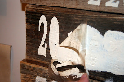 14. Now transfer the lettering to the board. Be sure it's centered. I made the mistake of being a little off centered on a few of mine and now it bugs me a bit. Using your scraper, gently scrape over the tape to adhere it to the wood nicely. Some of these boards have holes or really rough spots so make sure it's stuck all the way with no air pockets or gaps that paint can escape through. Then gently pull off the tape and the contact lettering will remain on the wood. Now you're ready to paint!